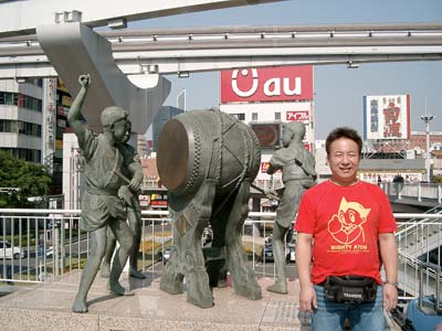 小倉祇園太鼓の像 JR小倉南口駅前にある。とってもいい天気!朝日がまぶしい!上に見えるのは、モノレールの線路です。