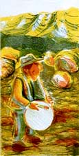 モンテ3〜幸福男(54X39石版画) 「MONTE」と呼ばれるペルー山岳地方のあるお祭りを、偶然通りかかった村で見た。 木の枝にはいっぱいのプレゼントが下がっている。 クライマックスにオノを持った男がやってきて木を切り倒し、 踊っていた人達がそのプレゼントを持って帰る。 果物やパンでできた首飾りをしている、その木を切り倒す係を 何と呼ぶのか聞きそこねたので、私は勝手に「幸福男」と名づけた。