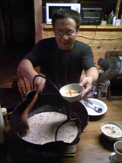 - 昼にはさらにゲットした鉄釜でご飯&鉄鍋クラムチャウダー。
