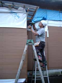 - 旦那は大家さんのコーちゃんと外壁貼りをする。