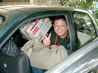 私のクルマで成田空港へ。荷物に埋もれながら後部座席に座るゆうちゃん。